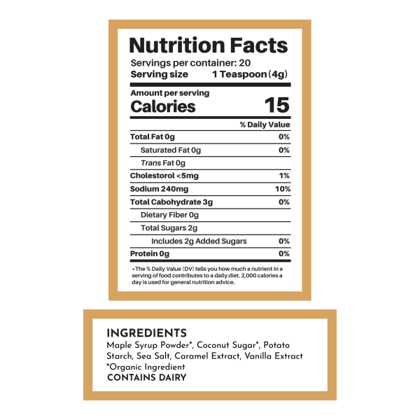Maple Syrup Powder*. Coconut Sugar*. Potato Starch. Sea Salt. Caramel Extract. Vanilla Extract