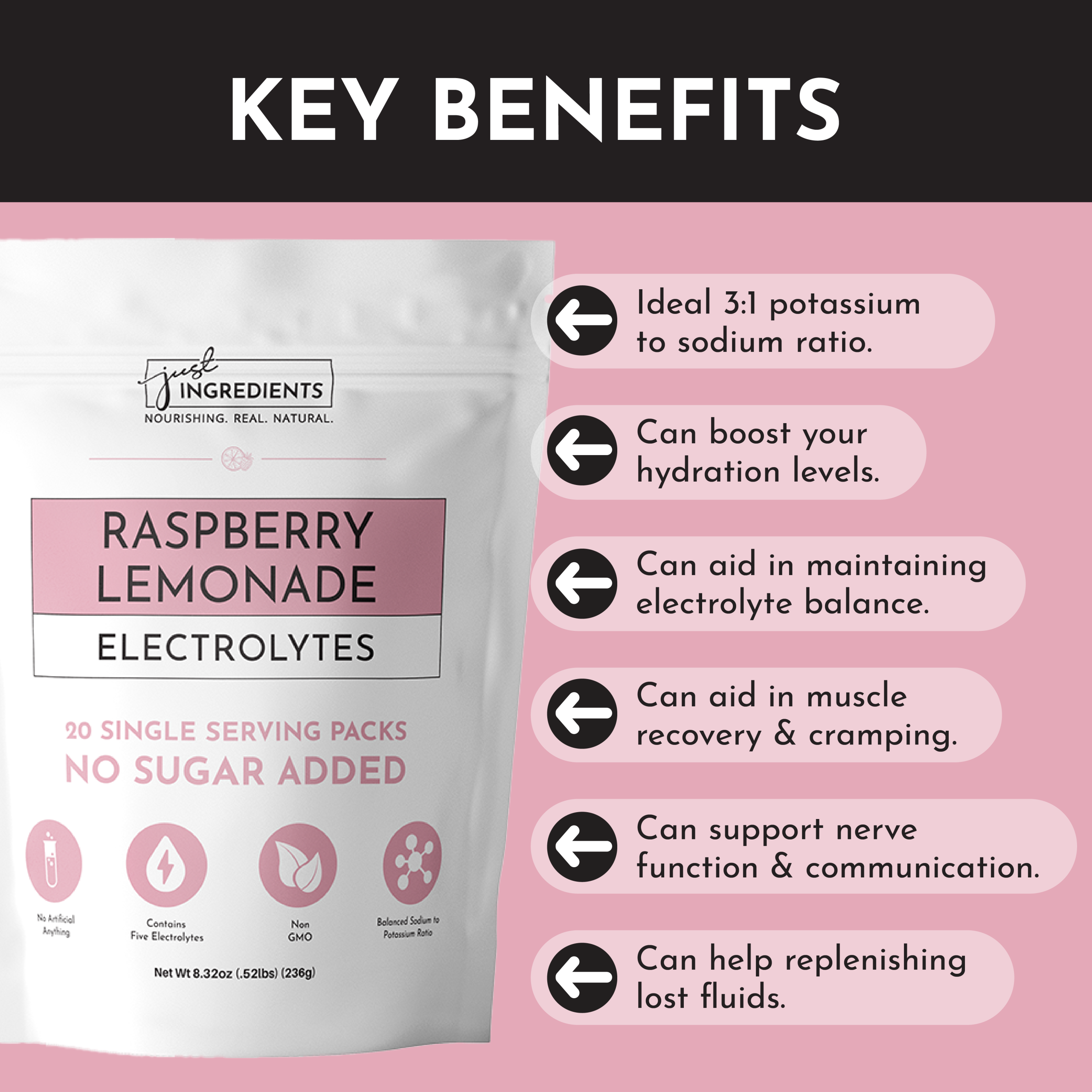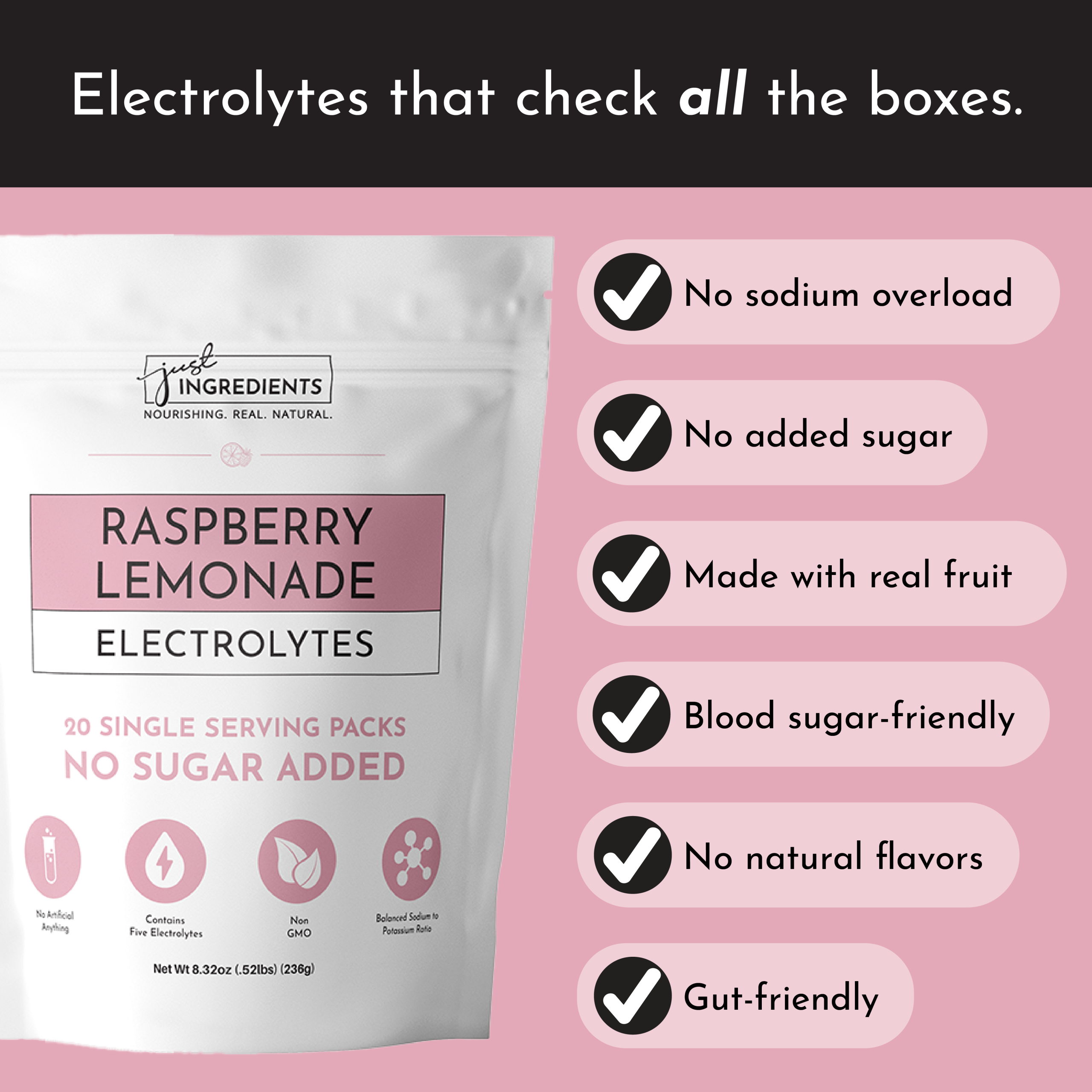 A delicious blend of sweet raspberries and tart lemons. Raspberry Lemonade Electrolytes are made with five different sources of electrolytes to support your hydration needs. With a 3:1 potassium to sodium ratio. you can enjoy balanced hydration without worrying about excessive sodium levels. Plus. they’re sweetened with nourishing ingredients. no artificial sweeteners or sugar alcohols.
