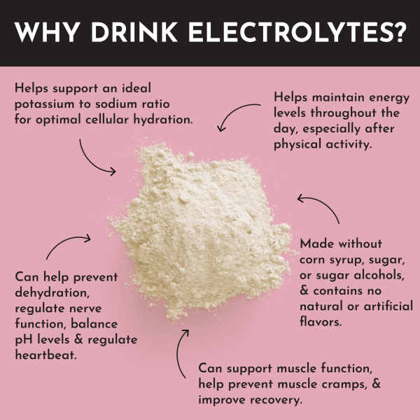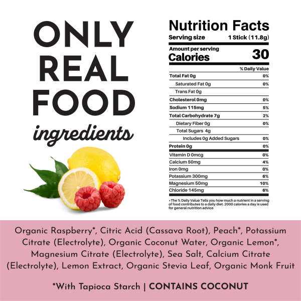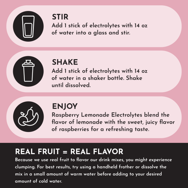 A delicious blend of sweet raspberries and tart lemons. Raspberry Lemonade Electrolytes are made with five different sources of electrolytes to support your hydration needs. With a 3:1 potassium to sodium ratio. you can enjoy balanced hydration without worrying about excessive sodium levels. Plus. they’re sweetened with nourishing ingredients. no artificial sweeteners or sugar alcohols.