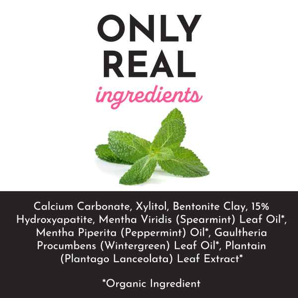 Calcium Carbonate. Xylitol. Bentonite. Hydroxyapatite. Mentha Viridis (Spearmint) Leaf Oil. Mentha Piperita (Peppermint) Oil. Gaultheria Procumbens (Wintergreen)Leaf Oil. Plantain (Plantago Major) Leaf Extract