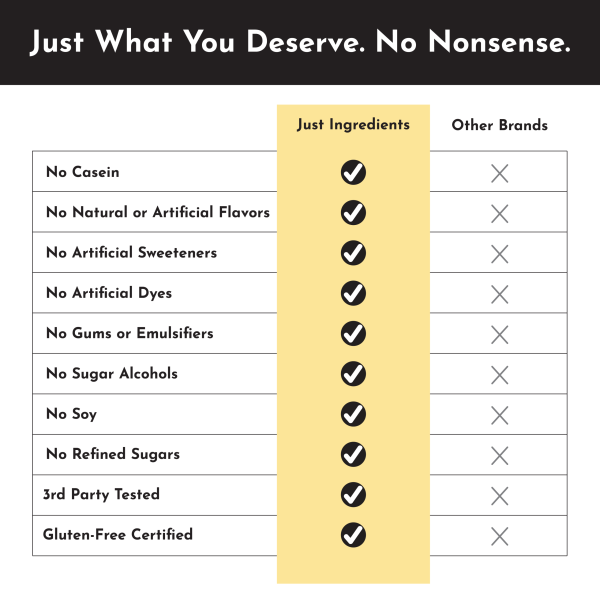 Just Ingredients’ natural protein powder is naturally sweetened and flavored with real foods and contains no artificial dyes. chemicals. or junk.
