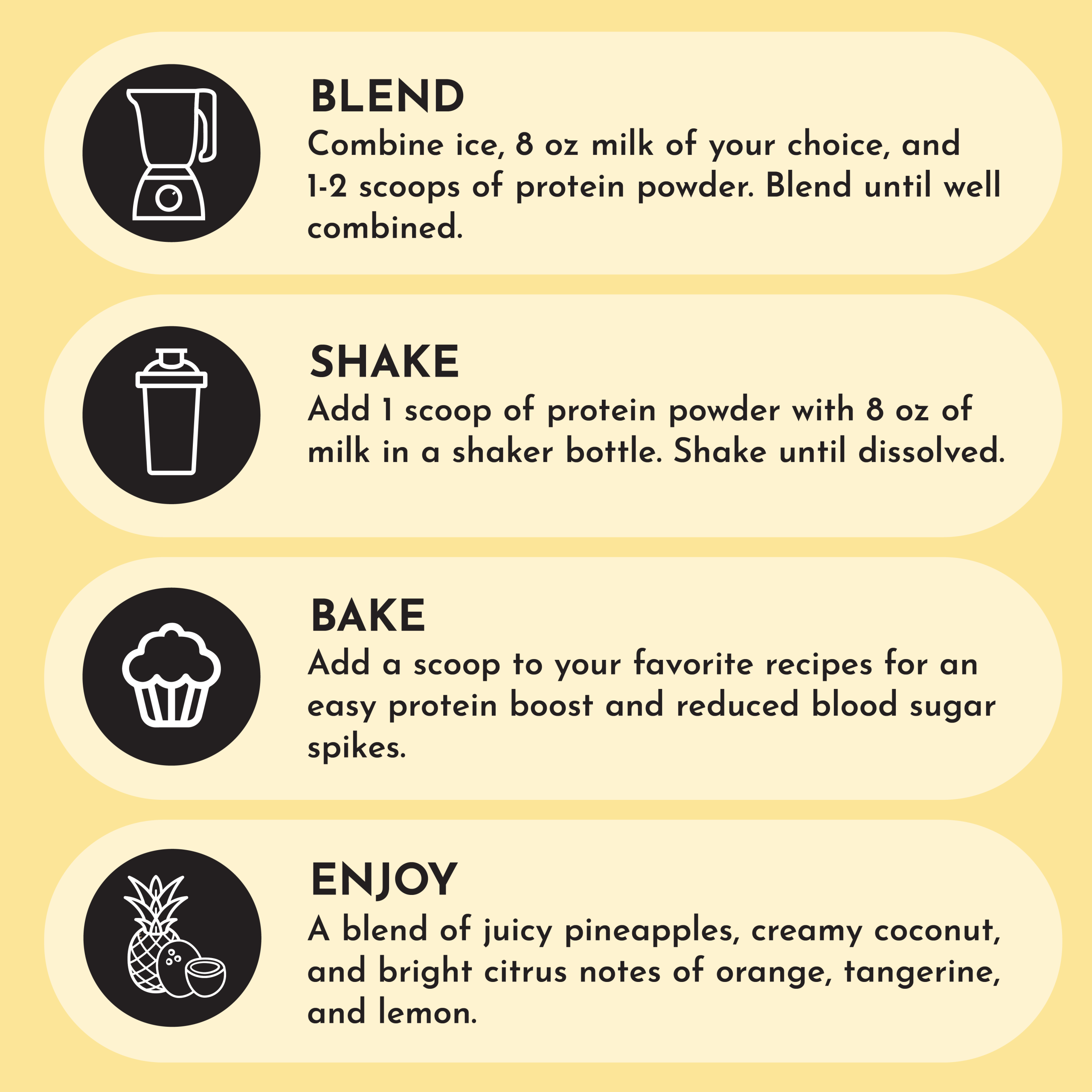 Sip on summer with our limited time. seasonal Tropical Paradise protein powder. Enjoy a creamy protein packed drink with pineapple. orange. and a hint of coconut.?