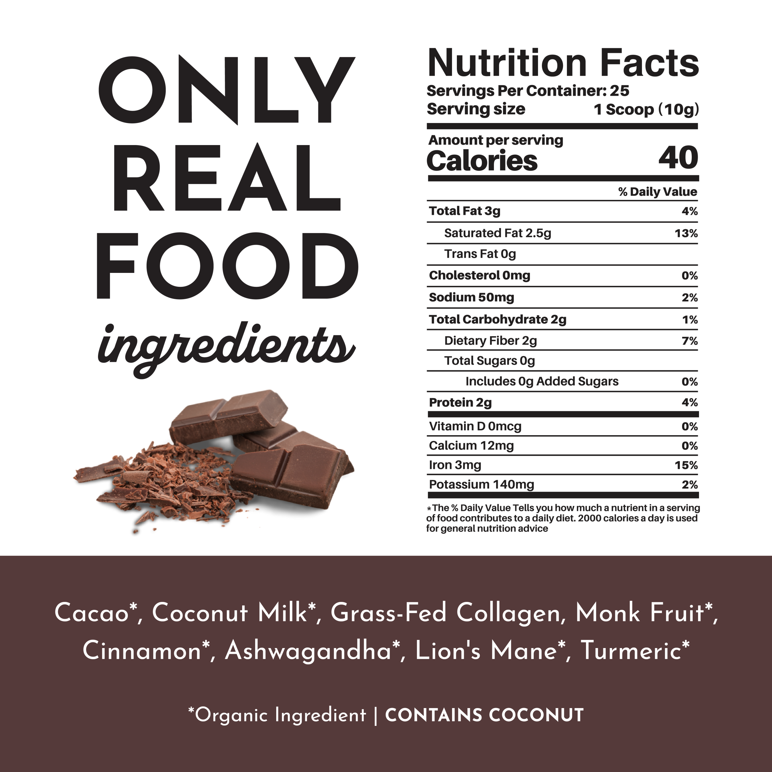 Cacao*. Coconut Milk. Collagen. Monk Fruit. Cinnamon*. Ashwagandha (root) Extract*. Lion’s Mane Powder*. Turmeric (root) Extract*