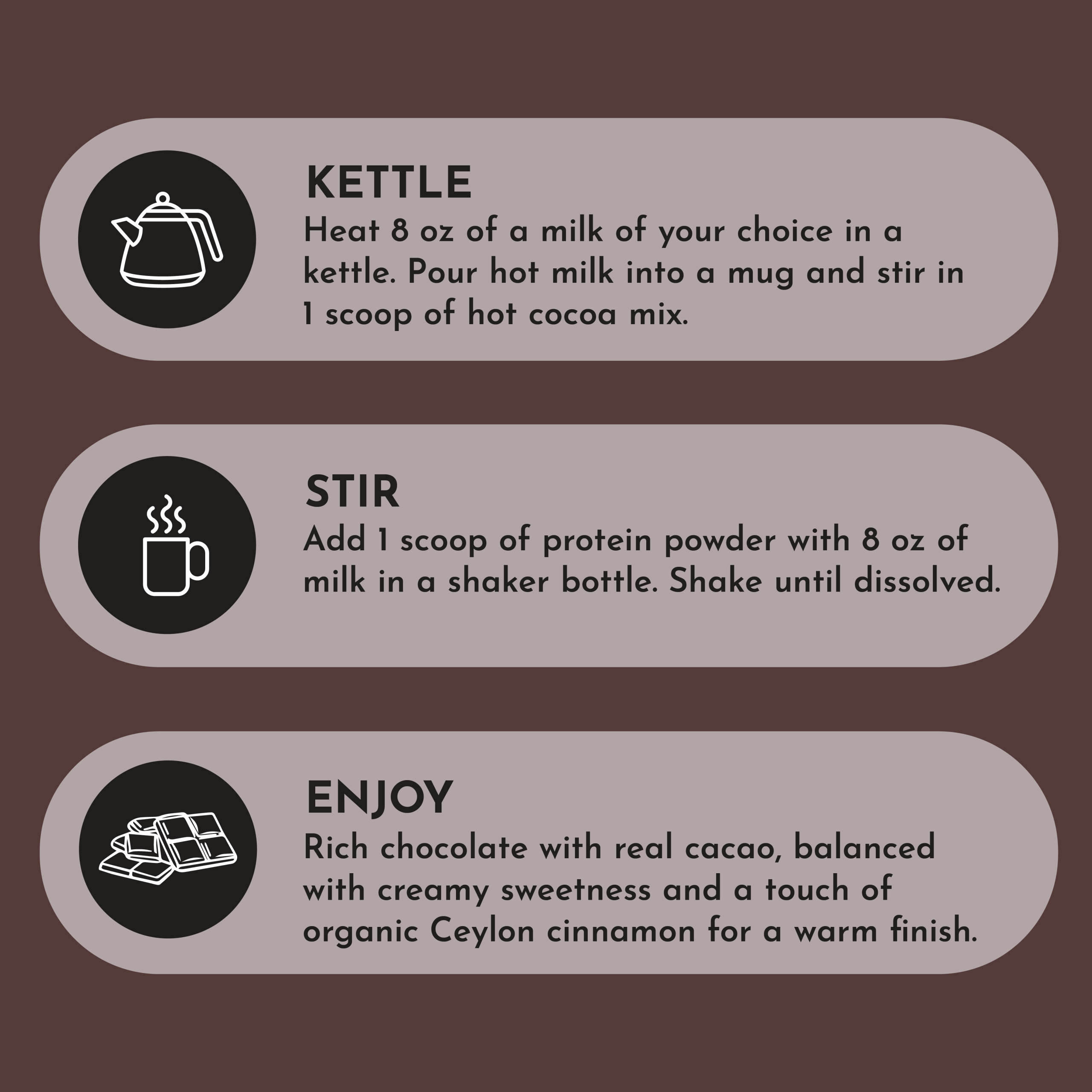 Kettle: Heat 8 oz. of a milk of your choice in a kettle. Pour hot milk into a mug and stir in 1 scoop of hot cocoa mix.