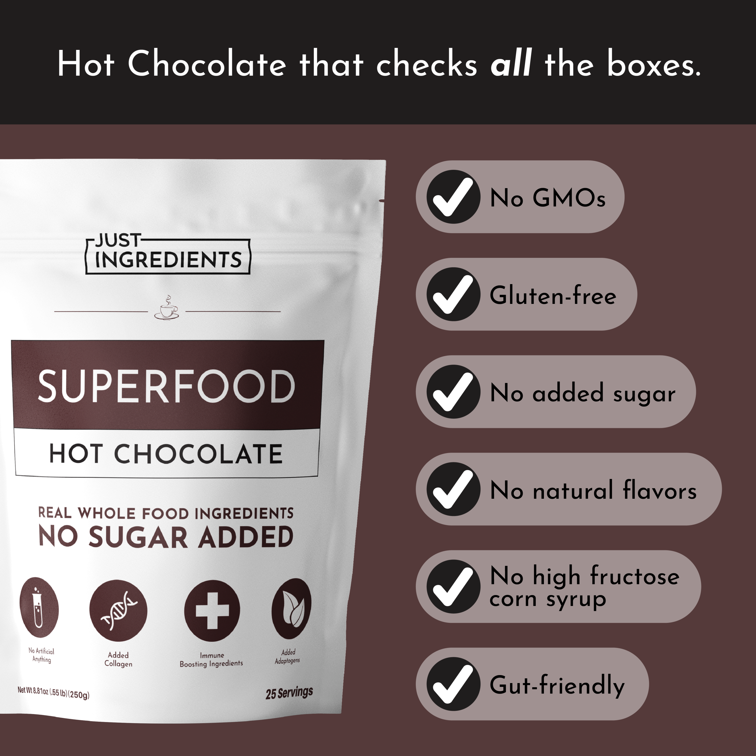 Just Ingredients Hot Chocolate is a 100% natural drink with no added sugar. Our rich hot cocoa blend combined with added adaptogens makes this the ultimate hot chocolate experience that the whole family will love.