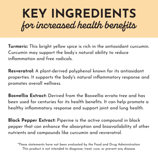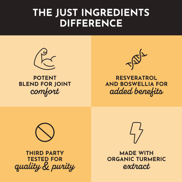 Just Ingredients Turmeric Complex is formulated to support joint comfort. a balanced inflammatory response. and overall immune health.* It features a concentrated turmeric extract standardized to 95% curcuminoids for enhanced potency. Black pepper extract is included to help improve the absorption of curcumin??the active compound in turmeric.* The formula also includes resveratrol and boswellia. which may offer additional support for a healthy inflammatory response and overall wellness.*