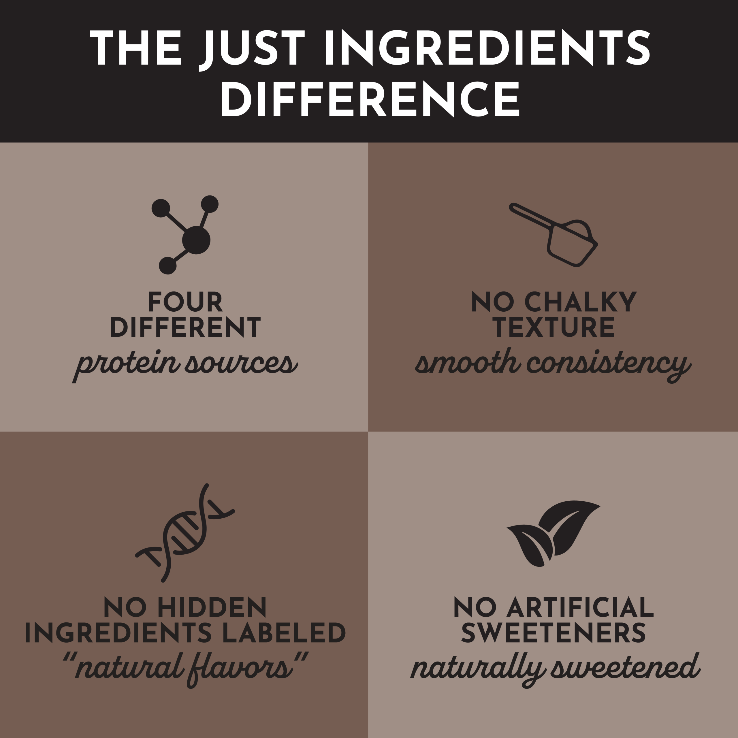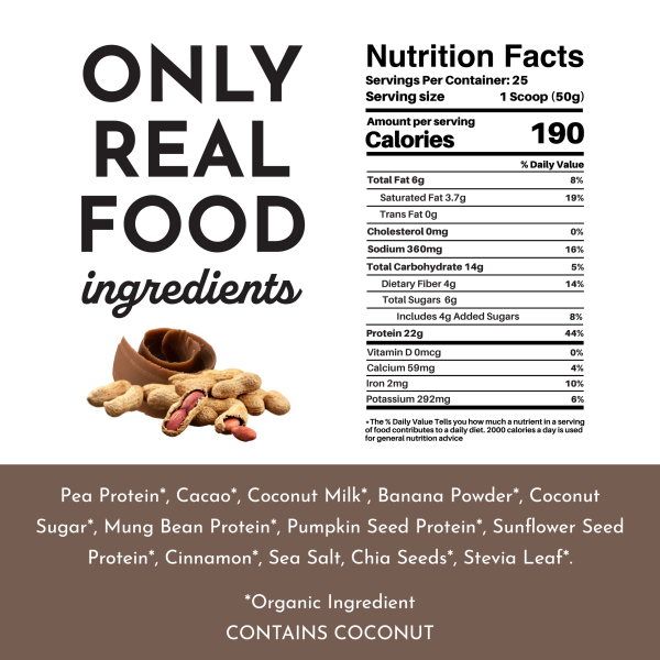 Pea Protein*. Cacao*. Coconut Milk*. Banana Powder*. Coconut Sugar*. Mung Bean Protein*. Pumpkin Seed Protein*. Sunflower Seed Protein*. Cinnamon. Sea Salt. Chia Seeds*. Stevia Leaf*.