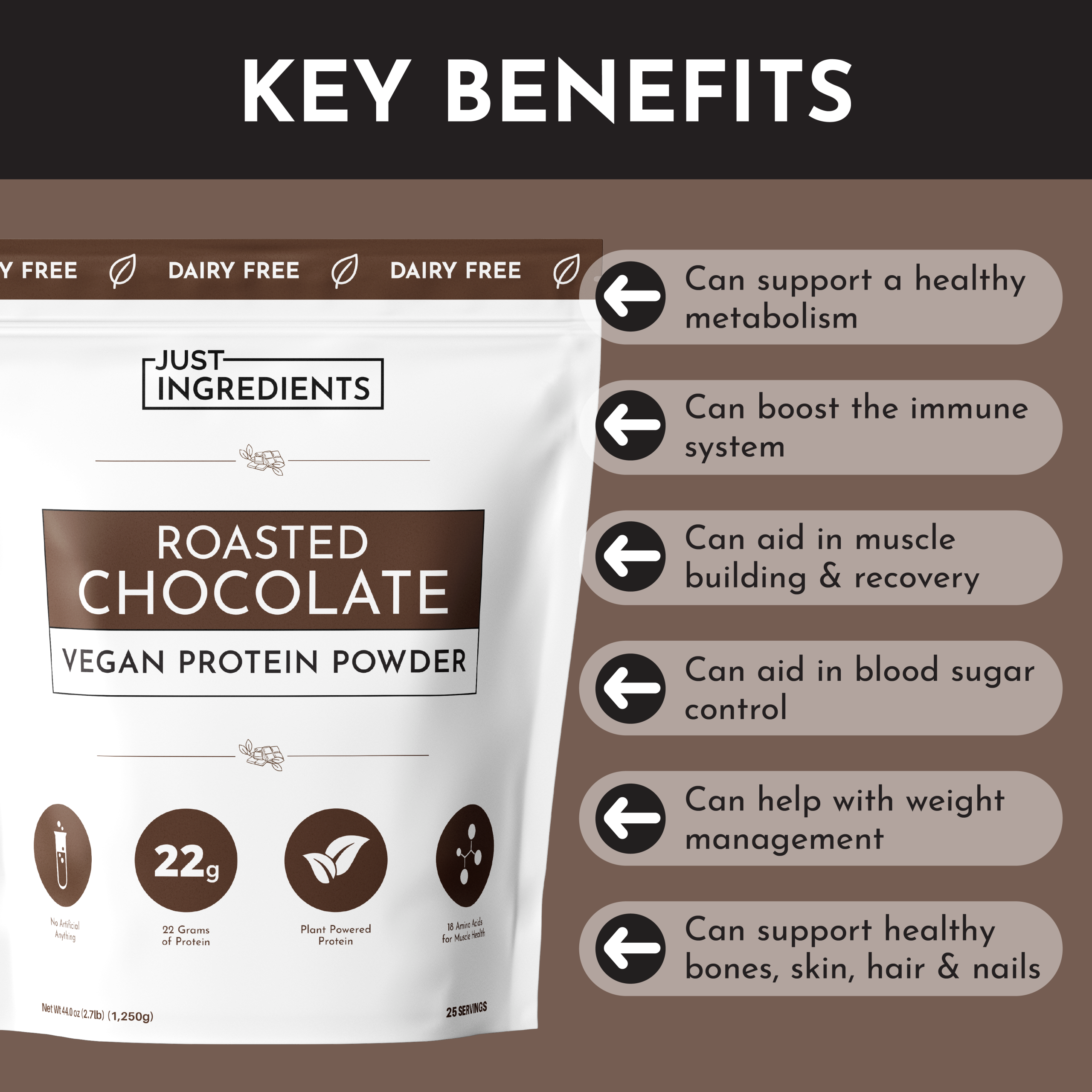 More than just a delicious treat. our Vegan Roasted Chocolate Protein Powder offers an educational exploration into plant-based nutrition. Beyond the chocolatey taste. you’re providing your body with all 10 essential amino acids and 8 more. plus a range of health benefits.