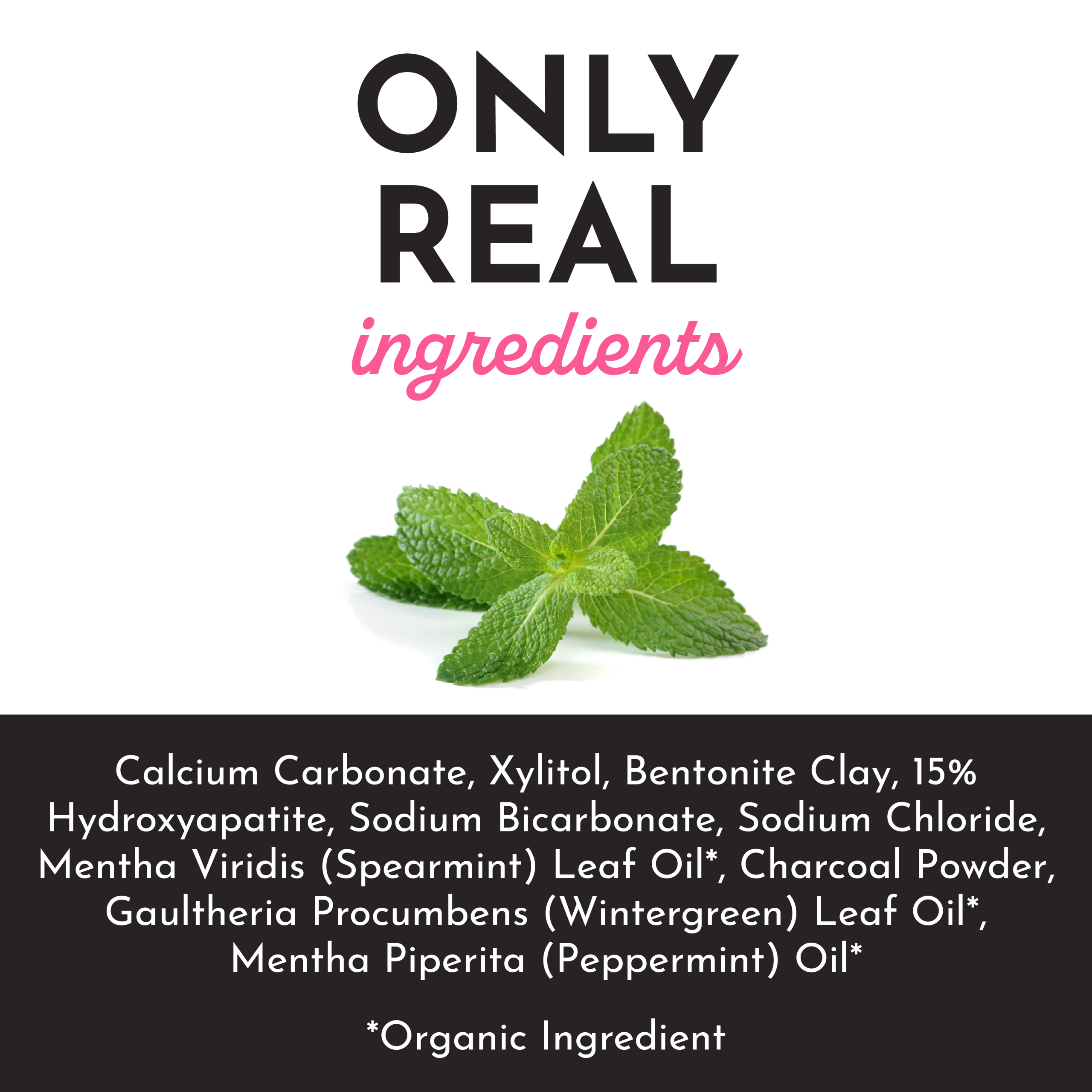 Calcium Carbonate. Xylitol. Bentonite. Hydroxyapatite. Sodium Bicarbonate. Sodium Chloride. Mentha Viridis (Spearmint) Leaf Oil. Charcoal Powder. Gaultheria Procumbens (Wintergreen) Leaf Oil. Mentha Piperita (Peppermint) Oil